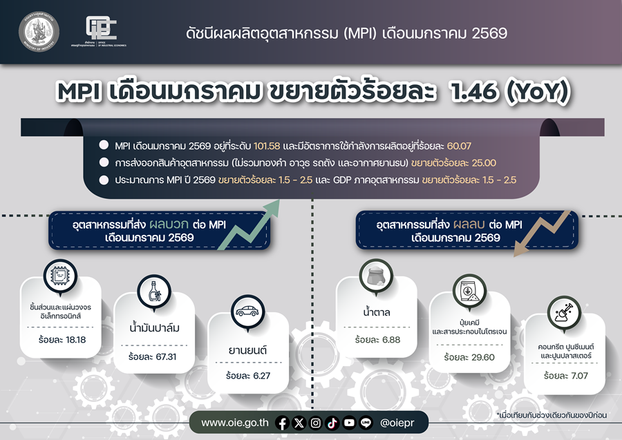 ม.ล.ปีกทอง ทองใหญ่ รองประธานสภาอุตสาหกรรมแห่งประเทศไทย (ส.อ.ท.) และประธานสายงานเศรษฐกิจและวิชาการ เผยผลสำรวจสถานการณ์ และแนวโน้มอุตสาหกรรมไทยปี 2569 ซึ่งรวบรวมความคิดเห็นของประธานกลุ่มอุตสาหกรรมจำนวน 48 กลุ่มอุตสาหกรรม รวมถึงประธานสภาอุตสาหกรรมภาคจาก 5 ภูมิภาค ในช่วงเดือน ต.ค.-ธ.ค.68 เพื่อประเมินทิศทาง แนวโน้ม และข้อเสนอแนะที่เกี่ยวข้องกับภาคอุตสาหกรรมไทยในระยะข้างหน้า โดยพบว่า 23 กลุ่มอุตสาหกรรมที่มีแนวโน้มทรงตัว ส่วนอีก 15 กลุ่มอุตสาหกรรมมีแนวโน้มขยายตัวดีขึ้น และอีก 10 กลุ่มอุตสาหกรรม มีแนวโน้มหดตัวลดลงจากปีก่อน