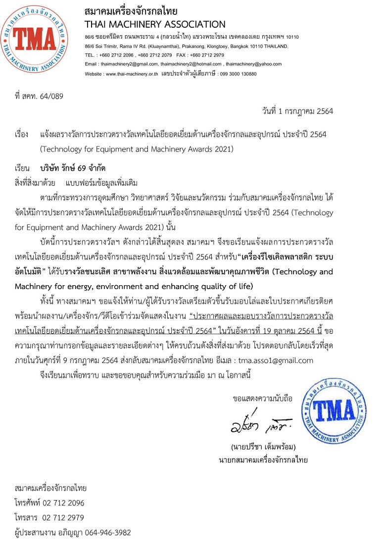 ด้วยรางวัลการันตีถึงประสิทธิภาพยอดเยี่ยมของเครื่องบดพลาสติกของ รักษ์69เอ็นจิเนียริ่ง “รางวัลชนะเลิศ เทคโนโลยียอดเยี่ยมด้านเครื่องจักรกลและอุปกรณ์ประจำปี 2564 สำหรับเครื่องรีไซเคิลพลาสติกระบบอัตโนมัติ สาขาพลังงาน สิ่งแวดล้อมและพัฒนาคุณภาพชีวิต (Technology and